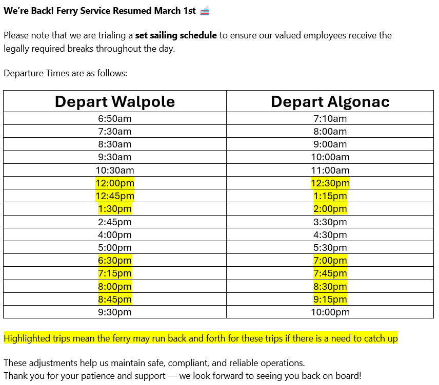 The ferry operates on the schedule posted below.
